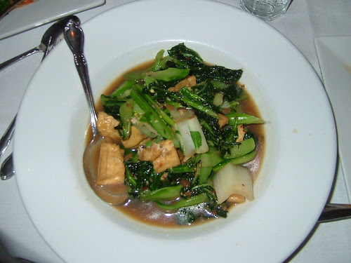 Henry's dish was vegan—bok choy and some other greens with tofu in a spicy brown sauce.